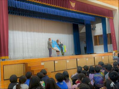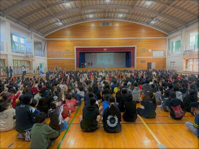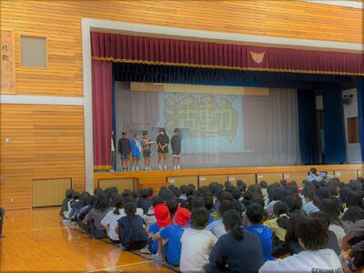 12月10日(水)の全体朝会では、赤い羽根共同募金の贈呈式が行われました。司会進行はボランティア委員会が務め、はじめに委員会の活動紹介がありました!